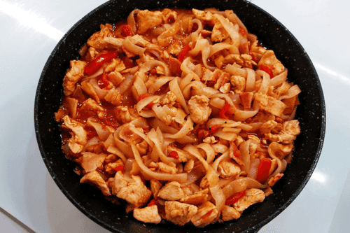 Вок с индейкой — это яркое блюдо паназиатской кухни, сочетающее нежное мясо, пикантные соусы и хрустящие овощи. Его история тесно связана с традицией быстрого жарения в раскалённом воке, позволяющей сохранить сочность ингредиентов и придать им аппетитную карамелизированную корочку. Индейка, дополненная томатным соусом и острым чили, приобретает насыщенный вкус, который гармонирует с сладковатым перцем рамиро и копчёной ноткой бекона. Добавление лапши ширатаки делает блюдо легким, но питательным, а процесс приготовления в воке гарантирует глубокий аромат. Идеально подходит для тех, кто ценит баланс между остротой и мягкостью, традицией и современными гастрономическими тенденциями.
