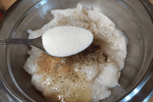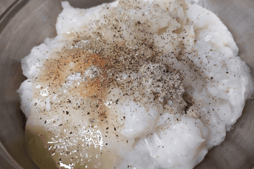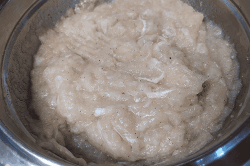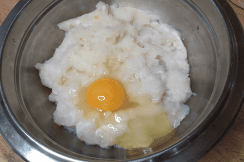 Филе пангасиуса пропустить через мясорубку либо измельчить в блендере.