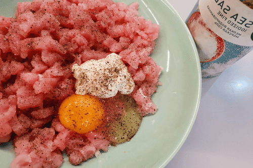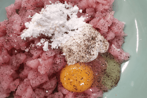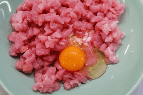 Некрупно нарубить мясо и добавить к нему яйцо.