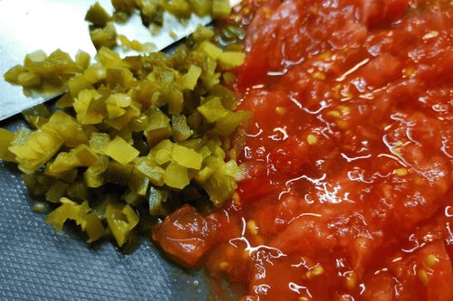 Добавить помидор с халапеньо. Перемешать.