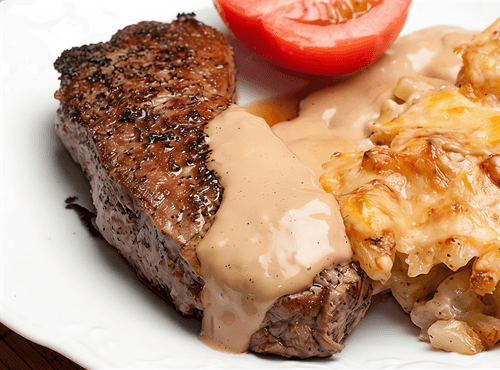 Стейки с соусом из розового перца — это изысканное блюдо американской кухни, сочетающее нежную говяжью вырезку с ароматным, бархатистым соусом. Розовый перец, известный своим мягким пряным вкусом с фруктовыми нотками, придаёт блюду особую утонченность. Исторически розовый перец использовался как экзотическая приправа, а в сочетании с бренди, белым вином и сливками он превращает классический стейк в гастрономическое наслаждение. Этот рецепт идеально подходит для романтического ужина или праздничного застолья. Подавайте его с зелёным салатом, чтобы подчеркнуть насыщенный вкус мяса и соуса. Гармония текстур и ароматов делает это блюдо незабываемым.