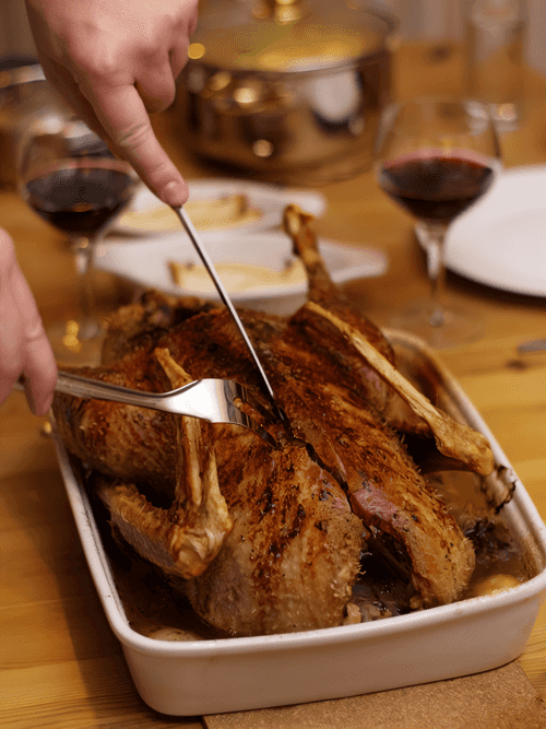 Рождественский гусь с каштанами и соусом Cumberland — это истинное воплощение праздничного ужина. Сочетание нежного гуся, запеченного до золотистой корочки, и ароматной начинки из яблок, апельсинов, картофеля, сельдерея, каштанов и изюма создаёт богатый вкус, идеально дополняющий атмосферу зимних торжеств. Этот рецепт берёт корни из американской кулинарной традиции, привнося в нее европейскую элегантность благодаря знаменитому соусу Cumberland. Готовится он из портвейна, апельсинового сока, уксуса и пряностей, доводится до насыщенного вкуса и подаётся холодным, контрастируя с горячим мясом. Каждая деталь в этом блюде продумана для создания праздничного настроения, а его насыщенный вкус и нежная текстура делают его центральным элементом рождественского стола.