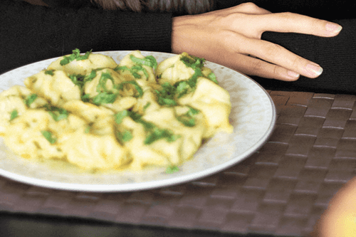 Раскатать тесто тонко, вырезать с помощью стакана кружочки и налепить пельменей, защипывая тесто сверху, как это делают с пирожками, чтобы получилась змейка. Отваривать пельмени в бульоне. Подавать с бульоном или без него.