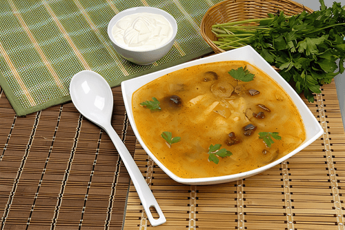 К курице налейте грибной суп и мелко нарезанные грибы. Все хорошо перемешайте. Сверху посыпьте моцареллой. Поставьте в духовку на 45 минут. Подавайте с зеленым салатом.