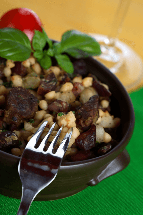 Вернуть в сковороду мясо, добавить предварительно вымоченный нут, куриный бульон, специи и варить около 1 часа, периодически помешивая.