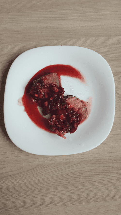 Через 5-10 минут разрезать мясо на медальоны и подавать с вишневой сальсой.