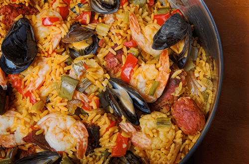 Быстрая паэлья с колбасой и морепродуктами – это современная вариация классического испанского блюда, которое в традиционном исполнении готовится с курицей, креветками и мидиями. Она сочетает насыщенные мясные ноты пикантной колбасы с нежной сладостью морепродуктов, создавая гармоничный баланс вкусов. Шафран придаёт рису золотистый оттенок и наполняет блюдо утонченным ароматом. Вино и бульон делают текстуру кремовой, а болгарский перец и горошек добавляют свежесть и легкую кислинку. Такая паэлья готовится всего за 15 минут и прекрасно подходит как для будничного ужина, так и для праздничного стола. Подается традиционно в сковороде, позволяя каждому насладиться богатством вкусов прямо с огня.