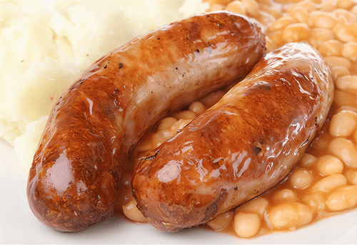 На каждую тарелку положите пюре, а сверху сосиски с соусом. Рядом выложите фасоль.
