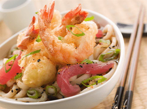 Жареная лапша удон с креветками, тофу и пореем