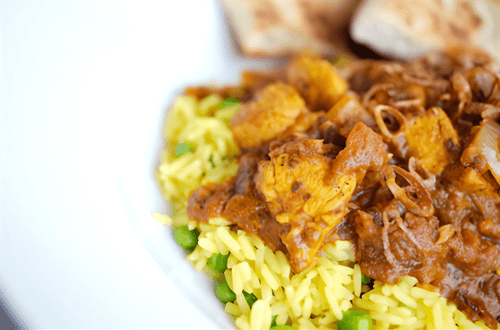 Тем временем, сварите рис в кипящей воде до мягкости. Слейте и разложите по 2 мискам. На тарелку выложите курицу с овощами и посыпьте оставшимися орехами и нарезанным кориандром. Подавайте вместе.