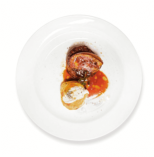 Когда все части блюда будут готовы, нужно выложить на тарелку мясо, сверху него — фуа-гра. Рядом выложить запеченную картофелину и ложку сметаны. Полить мясо соусом, сверху сбрызнуть трюфельным маслом.