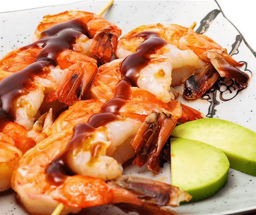 В ту же сковороду выложить креветки на шпажках и обжарить с обеих сторон. Готовить 3-5 минут в зависимости от размера креветок.