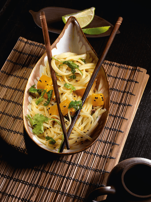 Широкая рисовая лапша с тыквенным карри
