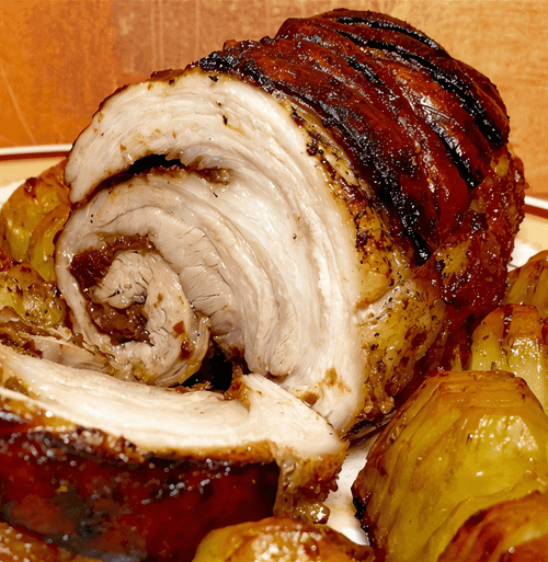 Разогрейте духовку до 160 градусов. Разогрейте большую сковороду и добавьте растительное масло. Придайте мясу форму рулета, по необходимости скрепите ниткой, и обжарьте со всех сторон по 2 минуты до золотистой корочки. Переложите в смазанную маслом огнеупорную форму.