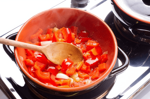 Лук нарезать дольками (четвертинками или восьмушками) и обжарить на сильном огне с маслом до мягкости. Затем добавить помидоры, через три минуты — перец и орегано. Довести до кипения и готовить еще 5-6 минут. Затем уменьшить огонь, накрыть крышкой и продолжить тушить. Через 8-10 минут влить в овощи вино и тушить, помешивая, до готовности.