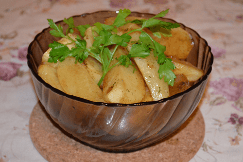Перемешать картофель и поставить в разогретую духовку на 30 - 40 минут (в зависимости от толщины кусочков картофеля).