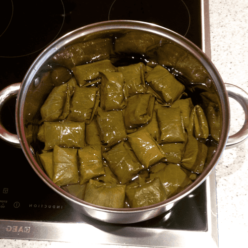 Когда вся долма будет сложена в кастрюлю, залить ее водой до последнего ряда и накрыть перевернутой тарелкой, чтобы во время варки долма не двигалась. Закрыть кастрюлю крышкой и поставить на средний огонь. Когда вода закипит, убавить огонь до низкого и варить около часа, пока рис не сварится.