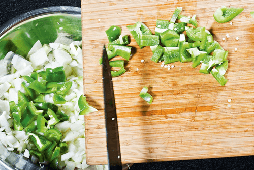 Мелко нарезать лук и болгарский перец. Небольшие кусочки сала кинуть в сотейник и держать двадцать-тридцать минут на небольшом огне, пока не образуется корочка. Получившиеся шкварки пойдут в гарнир, а в вытопленном жире будет тушиться мясо.