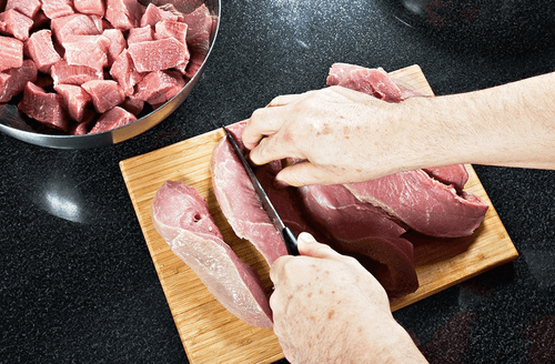 Нарезать телятину кубиками примерно три на пять сантиметров. Вместо телятины на пёркёльт можно пустить любое другое мясо или же ливер: говядину, свинину, курицу, печень и даже рубец.