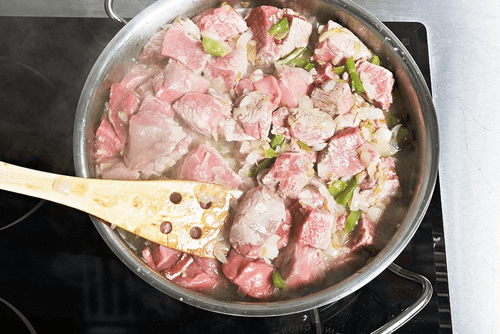 Слить в лук и перец жир от шкварок. Из хорошего куска сала должно получиться достаточно жира, чтобы пропитать весь лук. В крайнем случае можно долить растительного масла. Обжаривать, пока лук не станет прозрачным. Затем положить в сковороду нарезанное мясо.