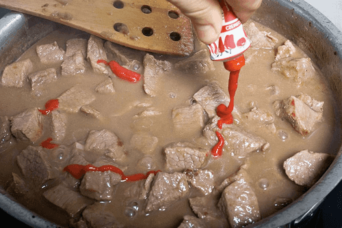 Добавить в мясо три столовые ложки пасты из паприки (в Венгрии она продается готовая, в тюбиках, но чтобы сделать ее самому, можно смешать в блендере сухую молотую паприку с растительным маслом).