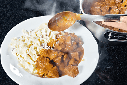 Пёркёльт и турошчуса — это квинтэссенция венгерской кухни, объединяющая насыщенные мясные ароматы и нежную сливочную текстуру. Пёркёльт, душистое тушеное мясо, готовится в ароматной смеси паприки, чеснока и специй, обретая глубокий вкус под воздействием медленного томления в винном соусе. Турошчуса — идеальный компаньон, представляющий собой широкую лапшу, увенчанную смесью творога, шкварок и сметаны, придающей блюду нежность и легкую кислинку. Этот дуэт — дань гастрономическим традициям Венгрии, где простые ингредиенты превращаются в кулинарные шедевры. Прекрасно подходит как для уютного семейного ужина, так и для знакомства с богатым венгерским наследием. Подавать его можно с картофелем или лапшой, создавая сытное и согревающее блюдо, которое оставляет незабываемые впечатления.