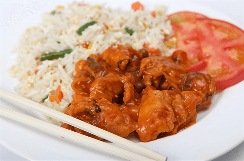 Сладкие куриные грудки во фритюре с зеленым луком, рисовым вином и цедрой апельсина