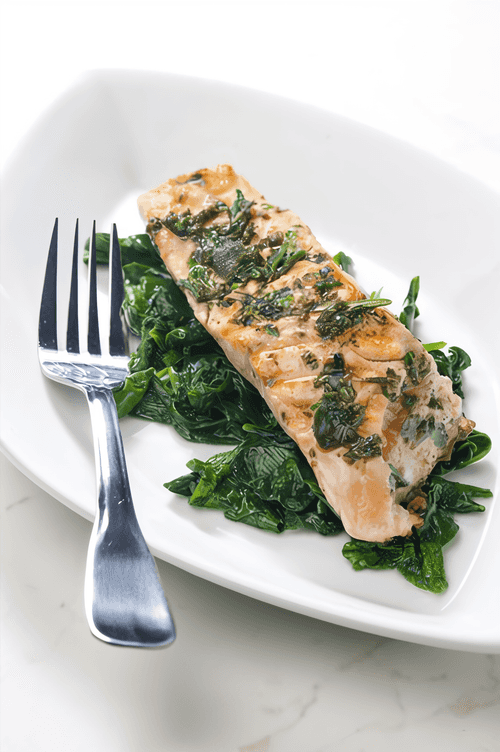 Лосось в бальзамической глазури со шпинатом, маслинами и изюмом