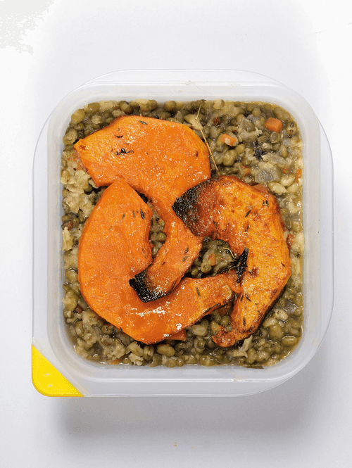 Нарезать тыкву ломтиками примерно в сантиметр толщиной, обмазать их оливковым маслом, посыпать солью, перцем, листиками розмарина и тимьяна. Разложить тыкву на противне и отправить на пятнадцать минут в духовку. На готовые ломтики капнуть немного меда и снова поставить в духовку еще на две минуты. Подавать с гороховой кашей.