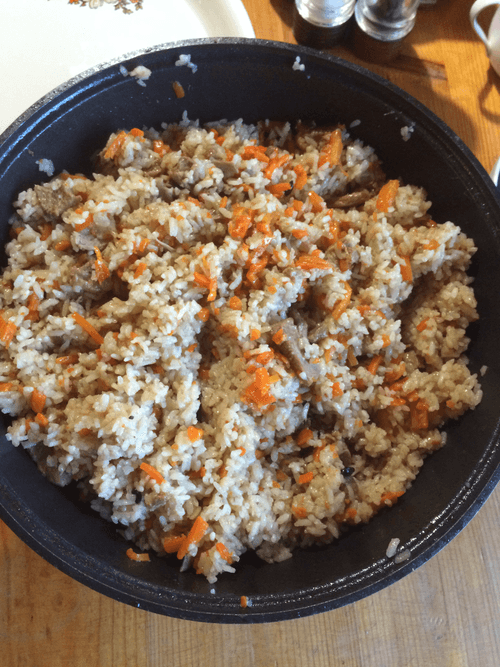 Теперь открываем наш казан. Достаем из него перец и чеснок и косточки. Хорошенько перемешиваем рис с овощами и мясом. Выкладываем плов на тавак (большое круглое блюдо, желательно глиняное). Сверху украшаем косточками, чесноком и перчиком.