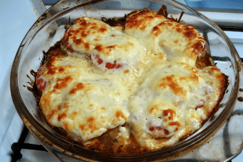 Начинаем укладку: помидоры кладем на мясо, от их сока мясцо наше размягчится еще больше и приобретет кислинку. Сверху выкладываем сырно-майонезную смесь, еще присыпаем сырком для красивой корочки. Закладываем форму в духовку. Запекаем 15 минут при температуре примерно 180 градусов.
