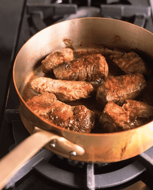 В сковороду с мясом влейте 250 мл процеженного маринада, доведите до кипения, уменьшите огонь, накройте крышкой и тушите примерно 1,5 часа, пока мясо не станем мягким. Добавьте вино и тушите еще 10 минут. Переложите мясо на тарелку.