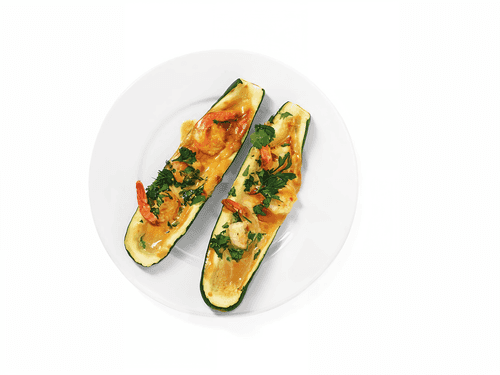 Вынуть из духовки цукини, нафаршировать лодки смесью пасты и креветок и поставить обратно еще на пятнадцать минут. При подаче посыпать петрушкой.
