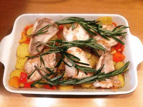 Филе морского черта, запеченное в духовке с овощами и розмарином