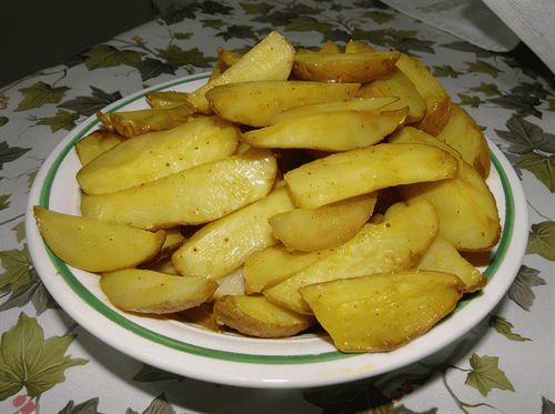Перемешать картофель руками, чтобы хорошо промазать маслом и специями.