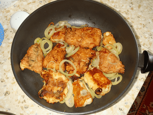 Затем сверху всего жареного филе положить порезанный кольцами репчатый лук, и оставить томиться. Минут через 10, снять с огня, рыба готова.