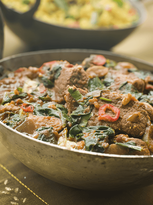Тушеная говядина в кокосовом молоке с карри — это яркое блюдо восточно-индийской кухни, пропитанное ароматами специй и нежностью сливочного кокосового молока. В основе рецепта лежит говядина, которая медленно тушится, впитывая богатый вкус карри, чили и лука. История этого блюда уходит корнями в индийскую традицию сочетания пряностей, создавая теплый, обволакивающий вкус. Нут придаёт текстурную насыщенность, а свежий шпинат — лёгкость и яркость. Оно идеально подходит как уютный домашний ужин, особенно в сочетании с ароматным рисом. Густая, пряная подлива делает это блюдо незаменимым для ценителей экзотических вкусов и насыщенных текстур.