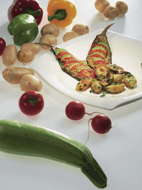 Выложить на промасленный противень шкурки баклажана, подсолить и ложкой нафаршировать баклажанным пюре. Сверху внахлест уложить по очереди дольки помидора и кабачка. Посолить, поперчить, посыпать сухарями и отправить на пять минут в разогретую до 200 градусов духовку.