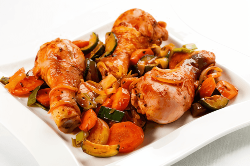 Подготовленную курицу разделать на порционные куски, обвалять в муке и обжарить на растительном масле. Добавить обжаренные овощи, потомить 5 минут, затем залить вином, смешанным с бульоном. Посолить, поперчить.
