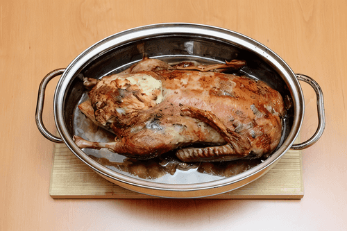 Утка с квашеной капустой и черносливом, запеченная в пиве