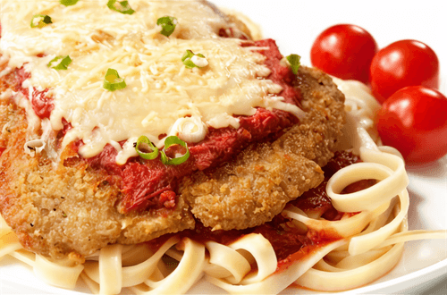 Телятина под сыром с томатным соусом, анчоусами и каперсами