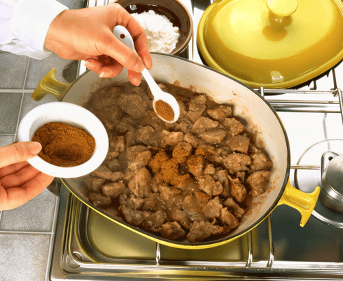 Приправить смесью карри, залить горячей водой или бульоном, посолить и тушить на слабом огне до полной готовности.