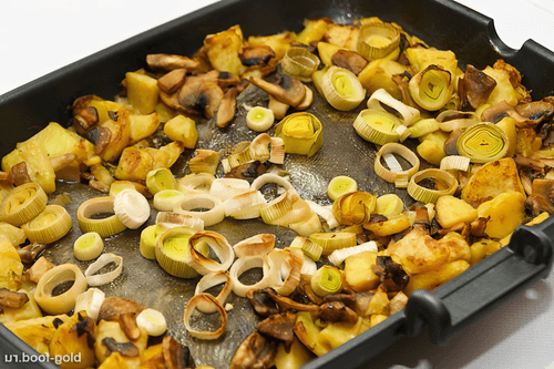 Поместить рыбу и жареную смесь в форму для запекания. Также выложить нарезанный кольцами лук-порей. Приправить солью и перцем, добавить оставшуюся зелень, оливковое масло и вино. Готовить при 160 градусах 40 минут.