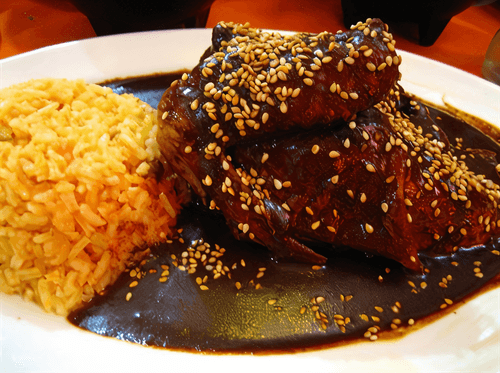 Куски индейки подрумянить в духовке в течение 30 минут, полить маринадом и готовить еще 40 минут. Выложить индейку на блюдо, посыпать жареными семечками кунжута и подать под соусом моле.