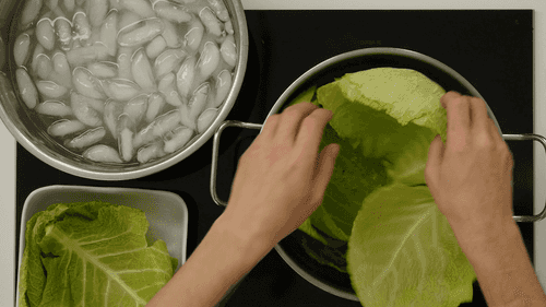Листья на три минуты положить в кипящую подсоленную воду, чтобы они стали помягче. Слегка приваренные листья переложить в ледяную воду, чтобы они окончательно не размякли.