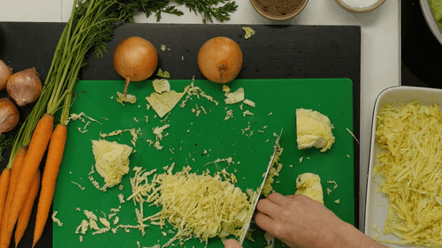 Нарезать тонкой лапшой оставшуюся капусту. На смеси сливочного масла и растительного припустить нарезанный мелкими кубиками бекон, добавить мелко нарезанную луковицу — обжарить до мягкости, добавить капусту, посолить, приправить щепоткой сахара и тушить, помешивая, семь-десять минут.