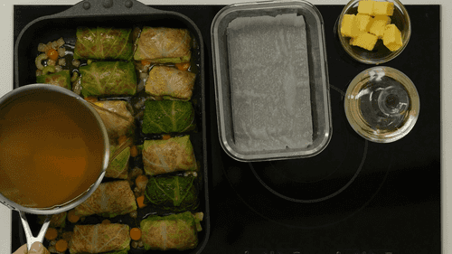 На смеси сливочного масла с растительным обжарить до карамельного цвета нарезанные крупно репчатый лук, одну морковь и стебель сельдерея. Пересыпать результат в глубокий противень, уложить сверху голубцы и залить их горячим говяжьим бульоном. Запечатать сверху фольгой, сделать несколько дырочек, чтобы выходил пар, и поставить в духовку, разогретую до 200 градусов, примерно на час.