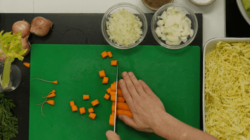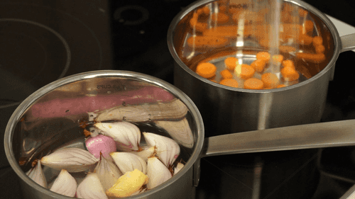 Оставшуюся морковь нарезать крупными кусками, очистить шалот, залить их — каждый в своей кастрюльке — водой, в которую добавлена щепотка соли, чайная ложка сахара и чайная ложка сливочного масла.