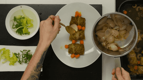 Готовые голубцы подавать с бульоном и карамелизованными овощами.