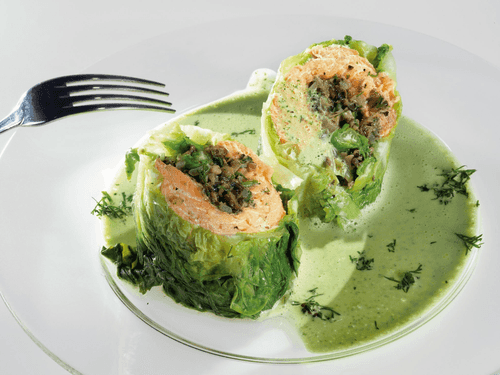 Голубцы из латука с форелью — это изысканное блюдо европейской кухни, объединяющее свежесть зелени и нежность рыбы. Это вариация классических голубцов, но вместо капустных листьев используется латук, который придаёт блюду легкость и воздушность. Форель, обладающая утонченным вкусом, гармонично сочетается с ароматными грибами, луком и чесноком, создавая богатую палитру вкусов. Легкое припускание рулетов в горячей воде сохраняет сочность ингредиентов и усиливает их естественные ароматы. Подавать их рекомендуется с сливочным маслом, взбитым с лимонным соком, что добавляет нежную кислинку и делает блюдо еще более выразительным. Голубцы из латука с форелью — это идеальный выбор для тех, кто ценит гастрономическое искусство и хочет попробовать нечто необычное, но в то же время элегантное.